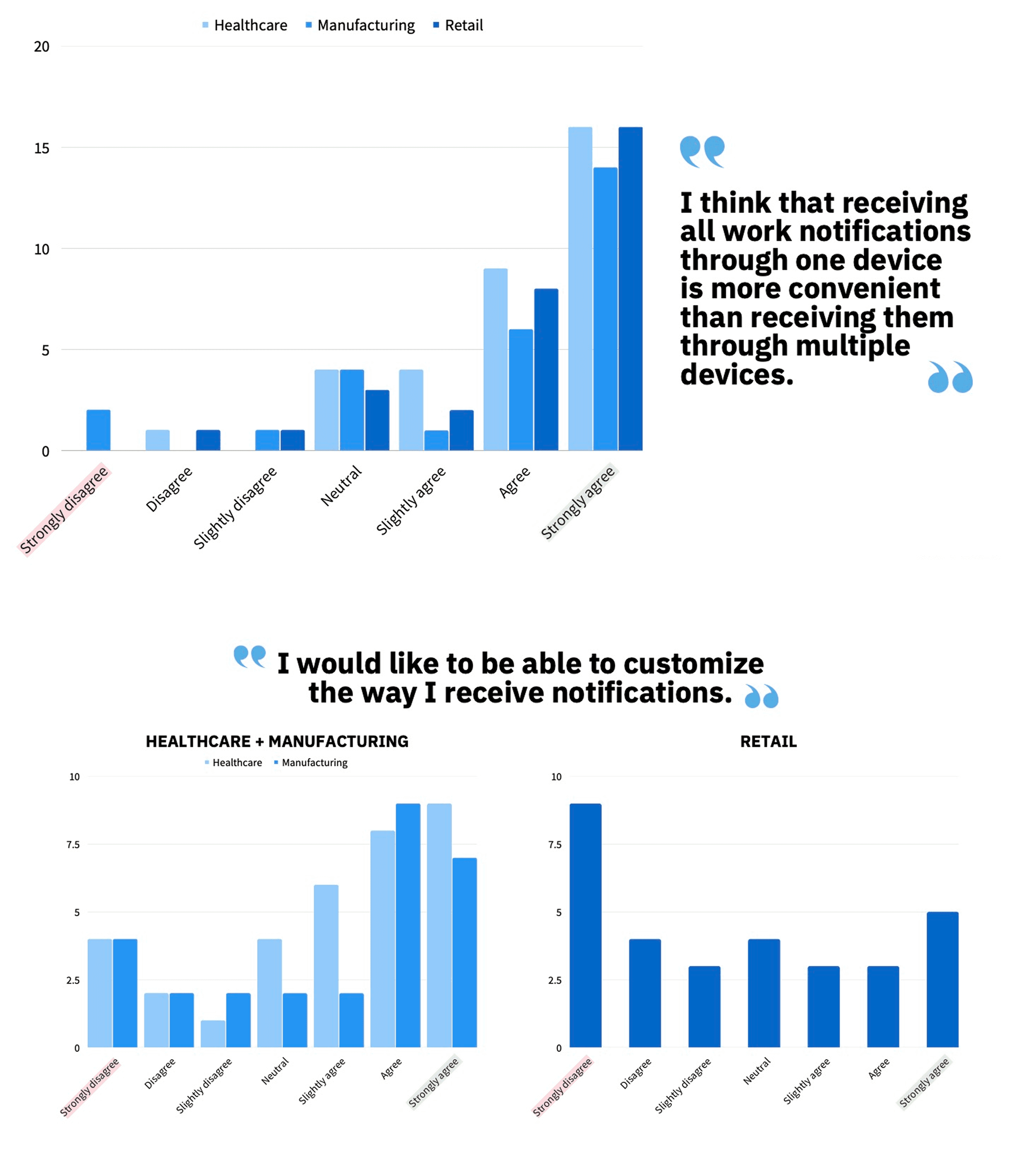 The sample covered healthcare participants, manufacturing / transportation / logistics, and retail. That mix made it possible to compare urgency, device ecosystems, and customization preferences across very different work environments.
