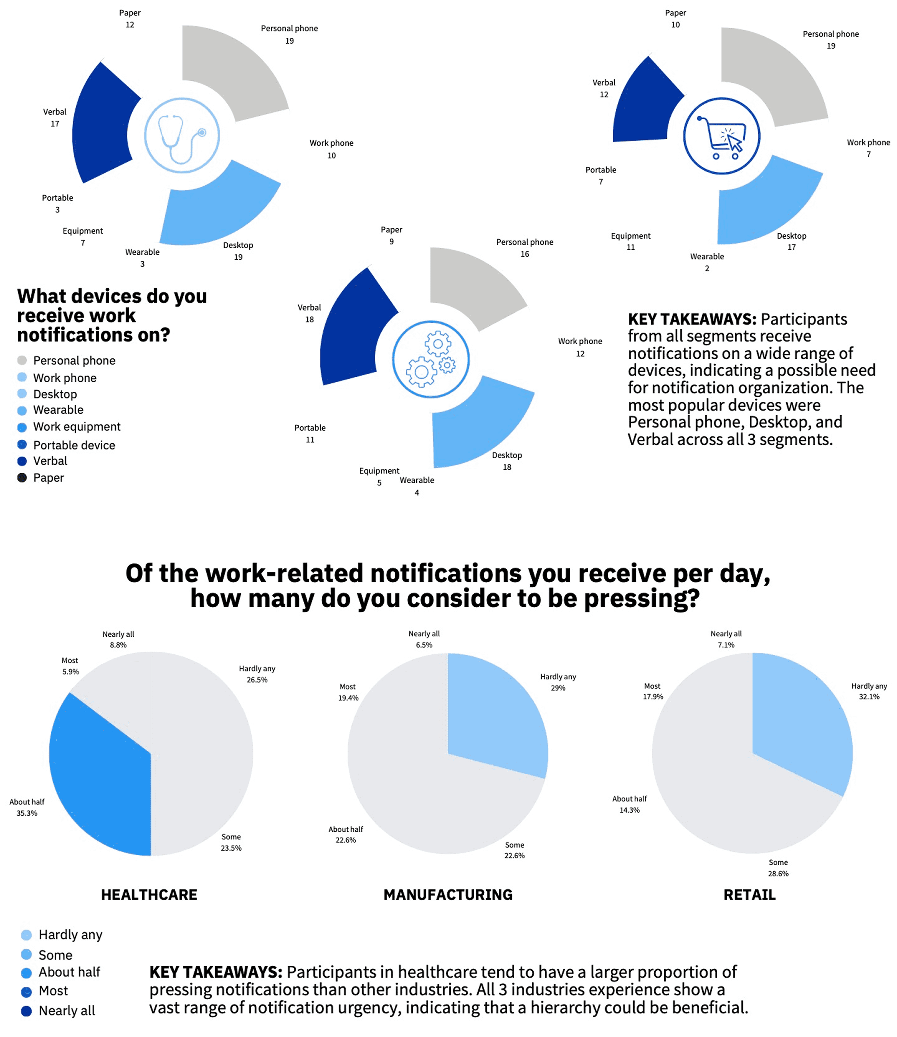 Several patterns stood out. Across all three verticals, participants received work notifications through a wide range of channels, with personal phone, desktop, and verbal notifications consistently among the most common.