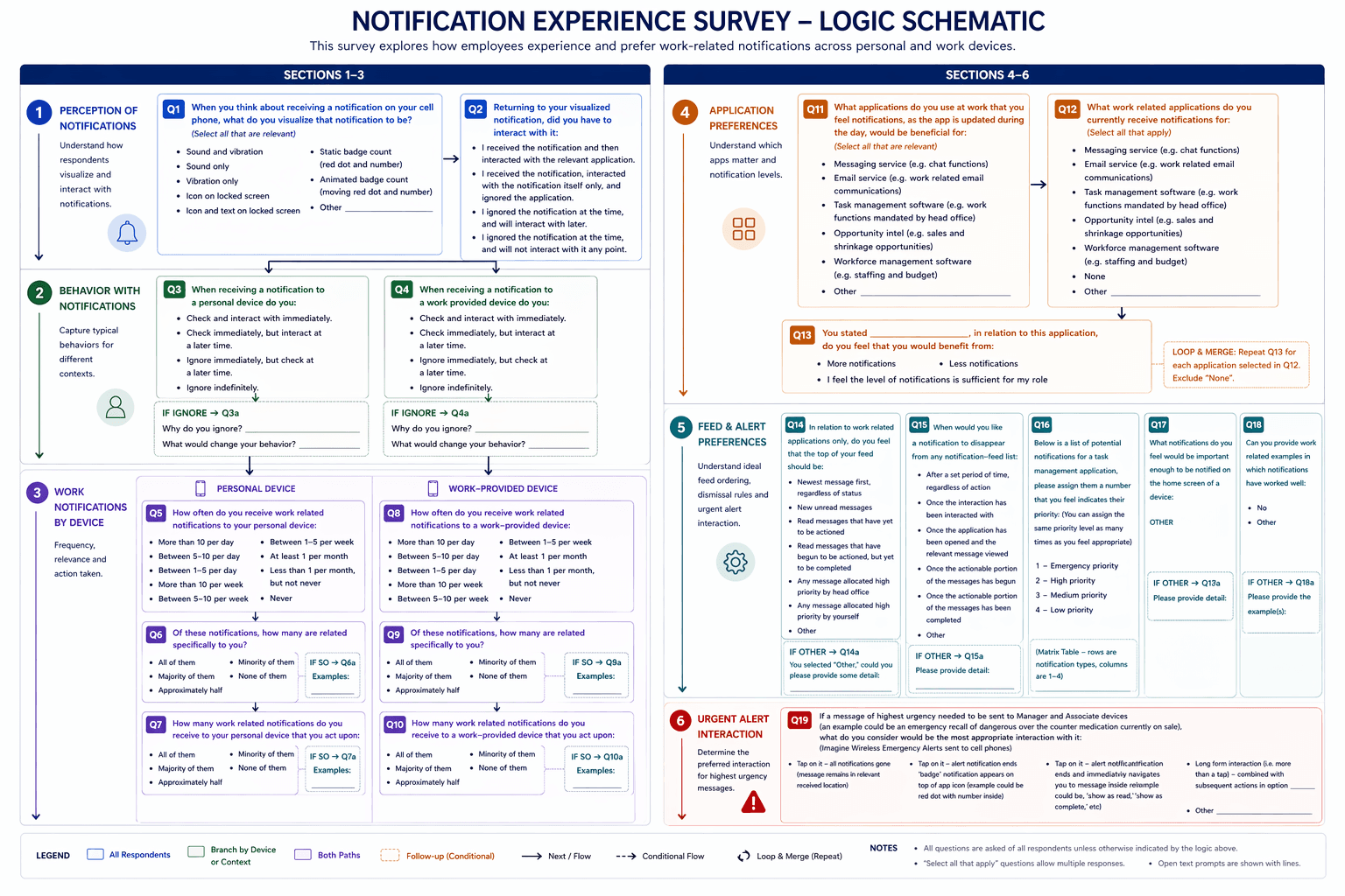 The work started with a broad set of questions: what differentiates active versus passive notifications, how notification needs differ across industries and roles, how delivery changes across devices and platforms, and how Zebra could better manage notification fatigue internally. Early literature review and SME interviews pointed to the same tension: urgency varies widely, but most systems do a poor job of reflecting that. Healthcare was especially instructive because alarm fatigue is already well understood there, but similar issues were also showing up in manufacturing and retail, where workers deal with time-critical tasks, multiple channels, and a wide mix of device types.
