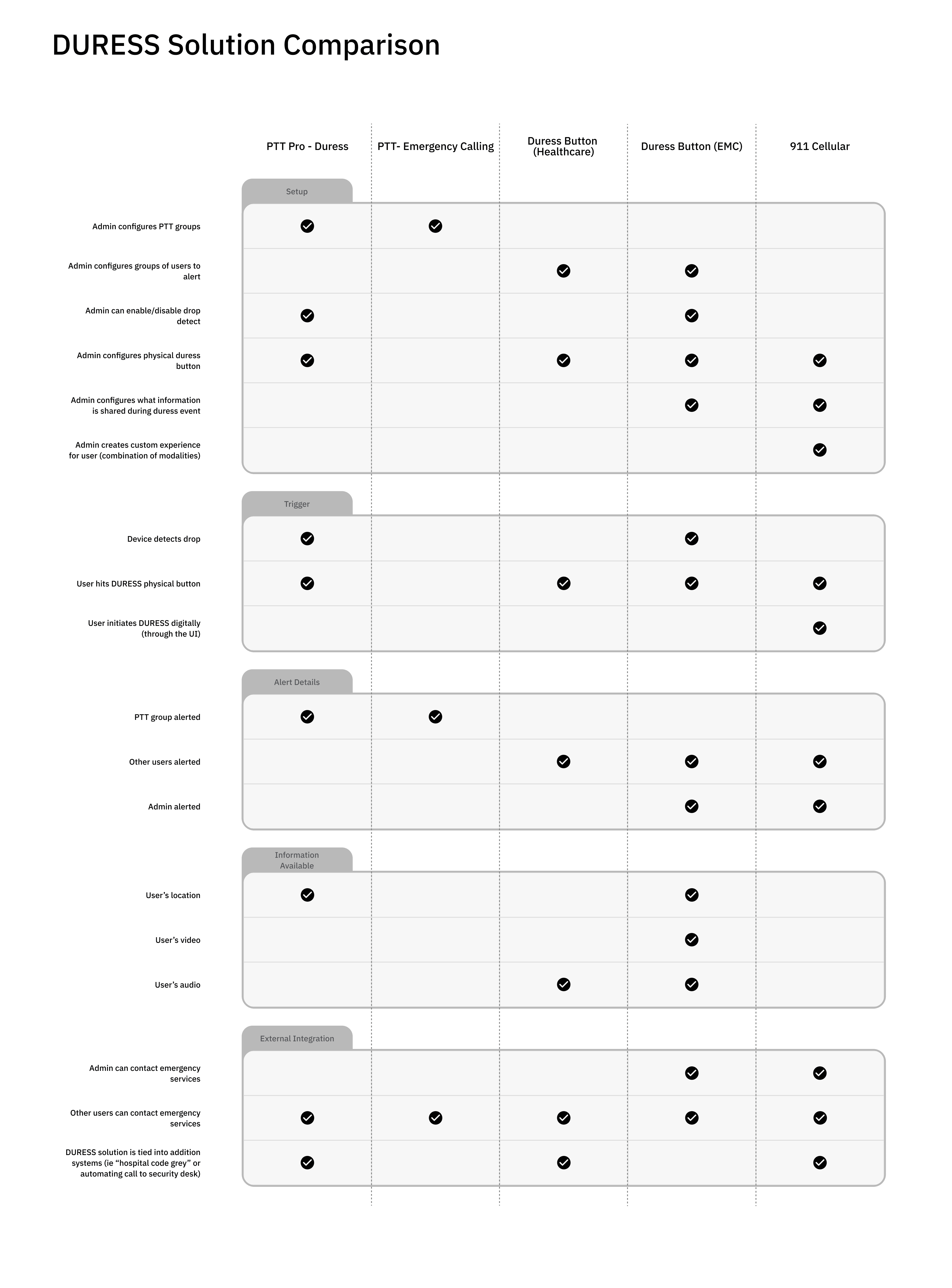 Comparative solution analysis across PTT, healthcare duress, EMC, and 911